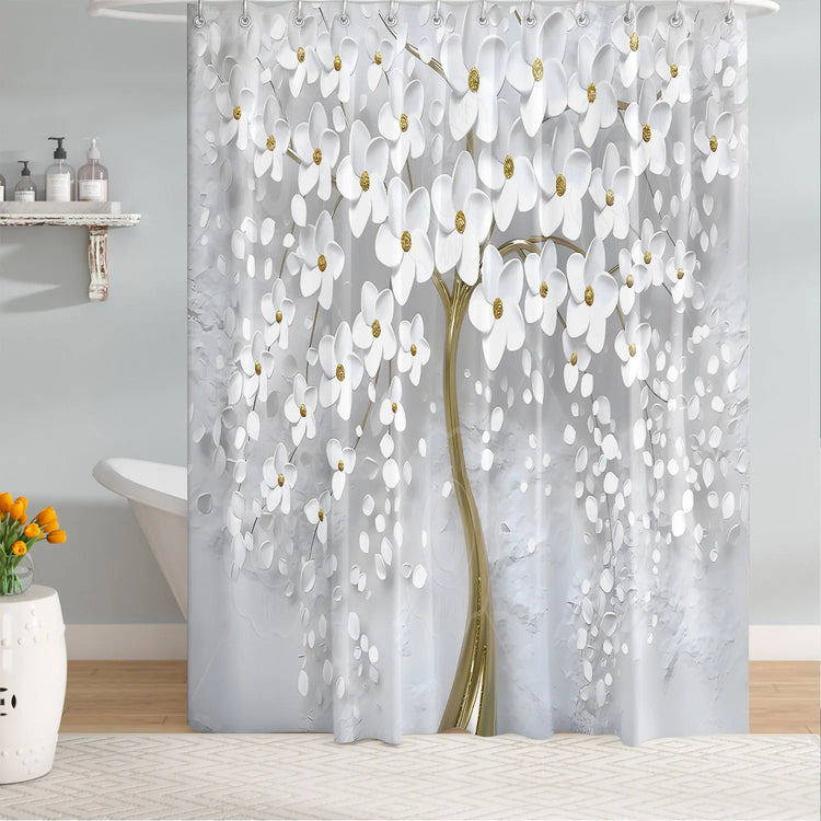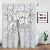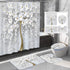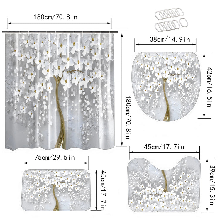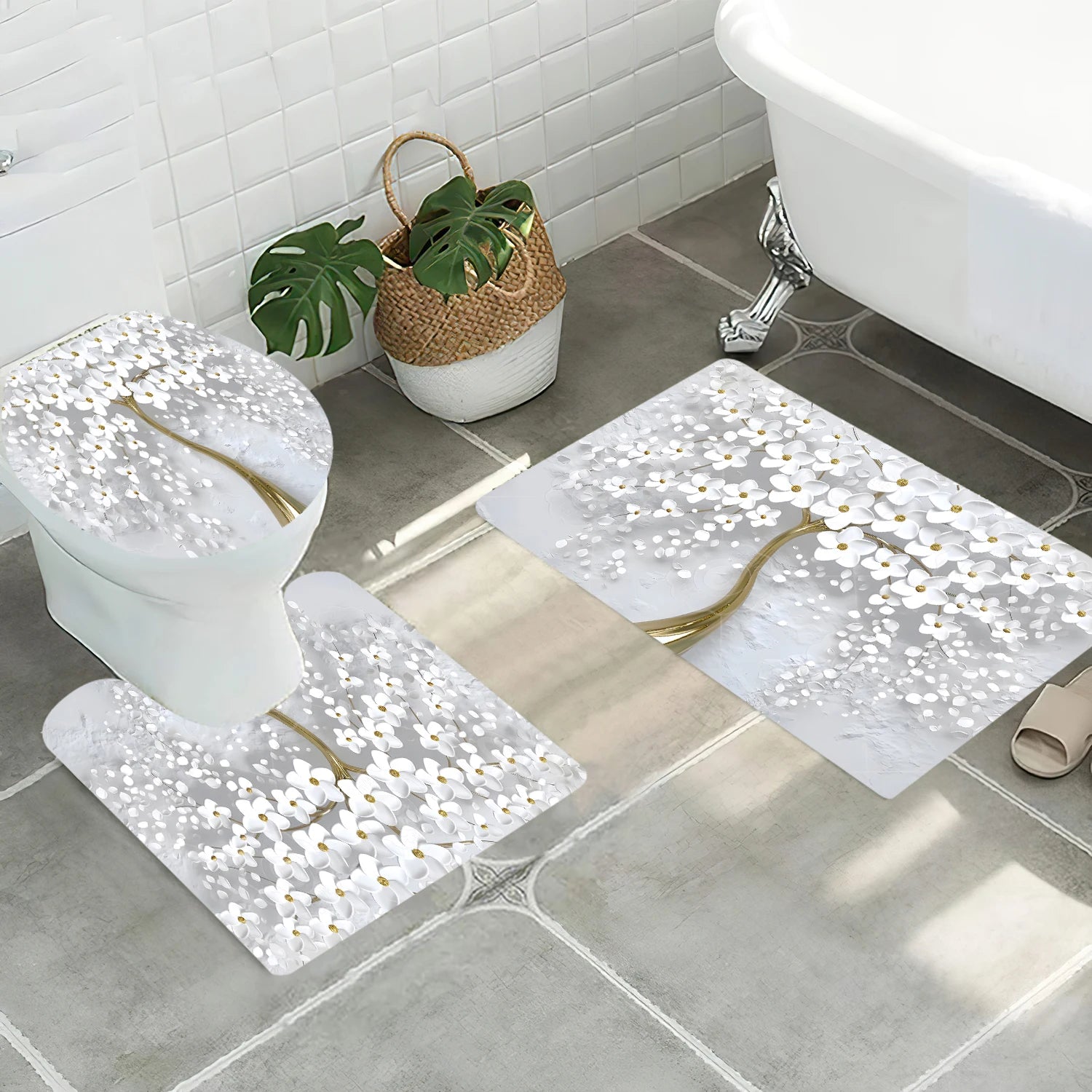 A 1/3/4-piece bathroom set featuring an abstract white floral design. It includes a shower curtain, non-slip bath mat, and toilet U-shape mat, adding elegance and harmony to your bathroom décor.