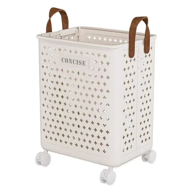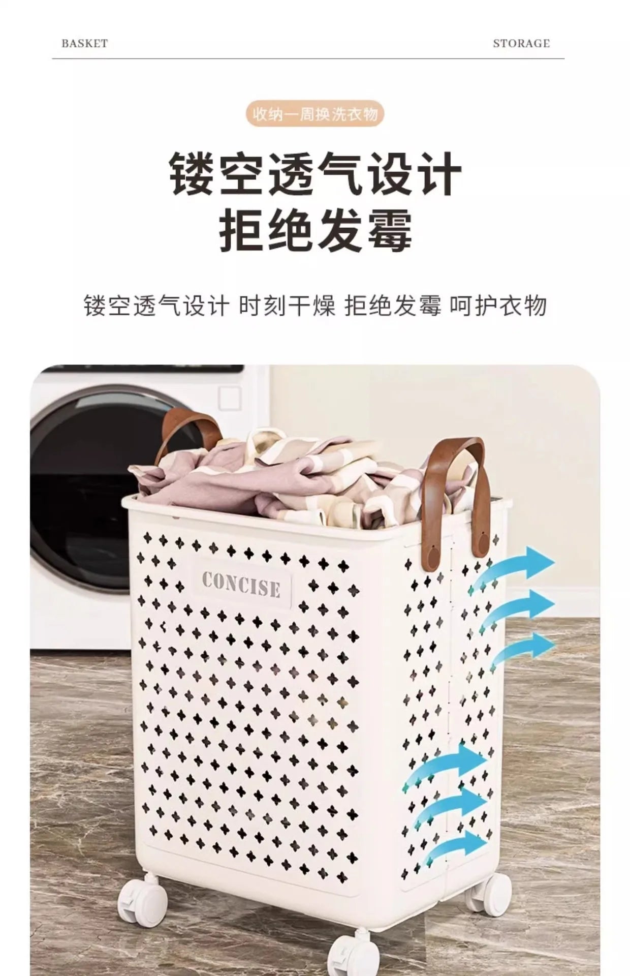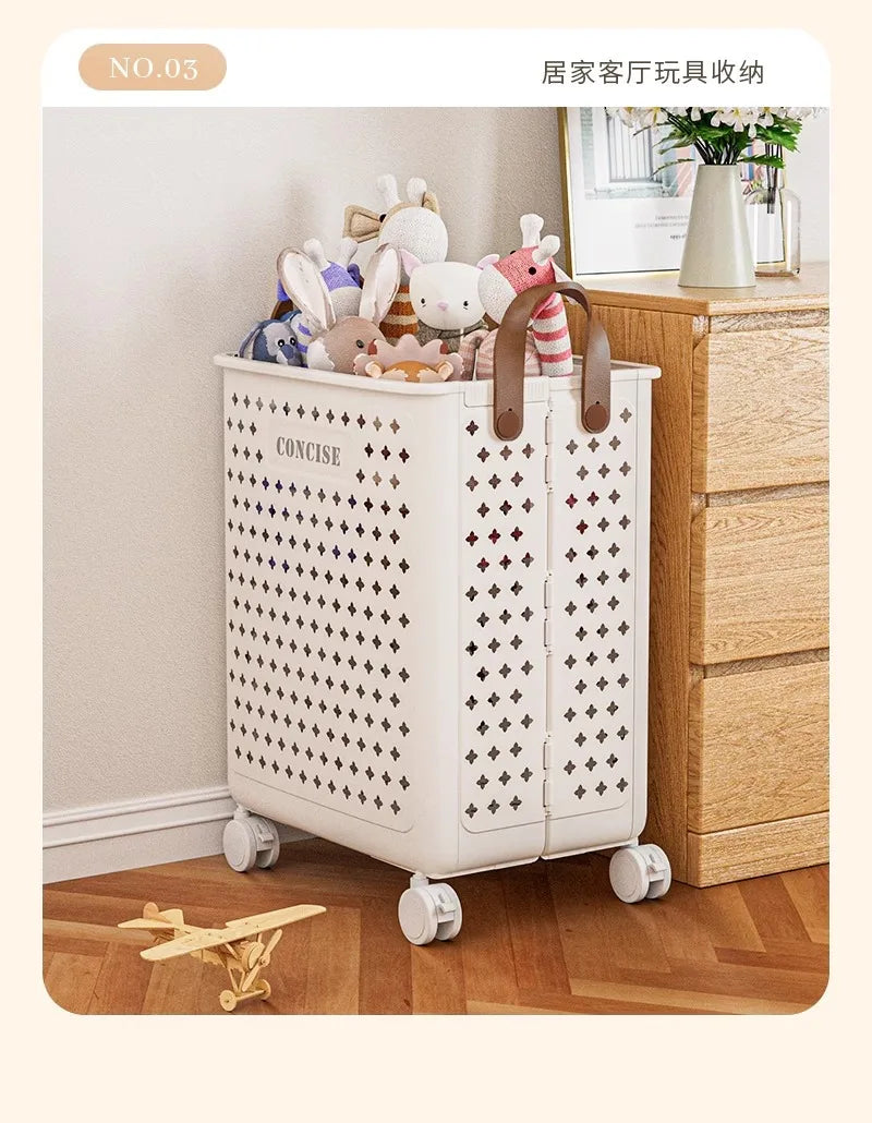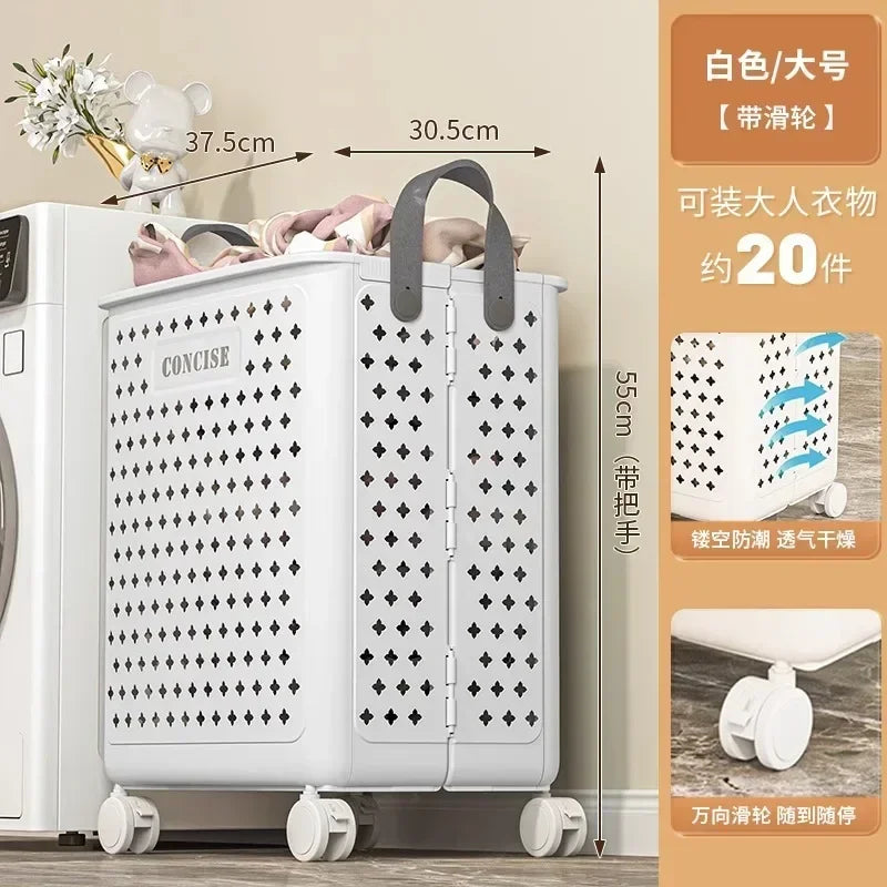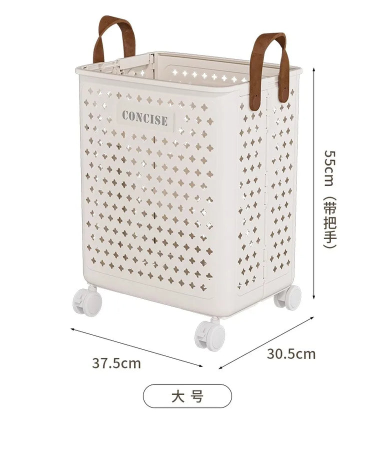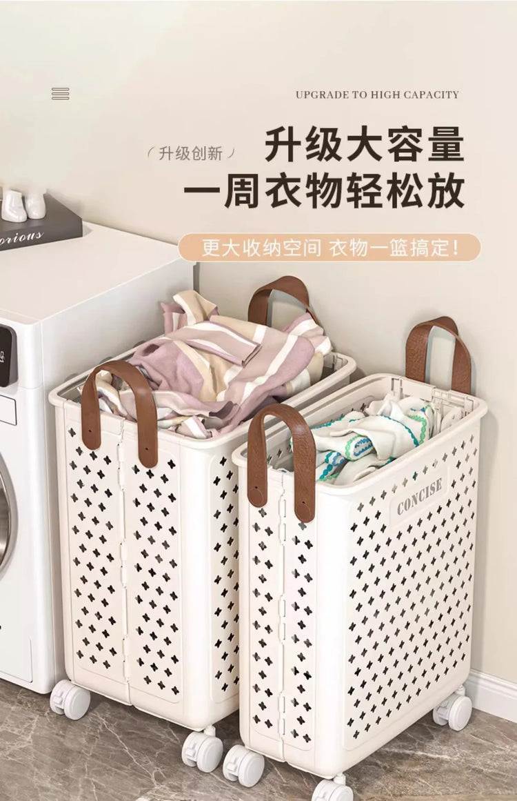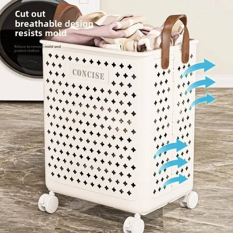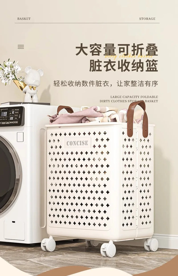 A folding laundry basket with wheels and a convenient handle for easy movement. Its hollowed-out, breathable design provides ample storage space while keeping clothes fresh and organized.