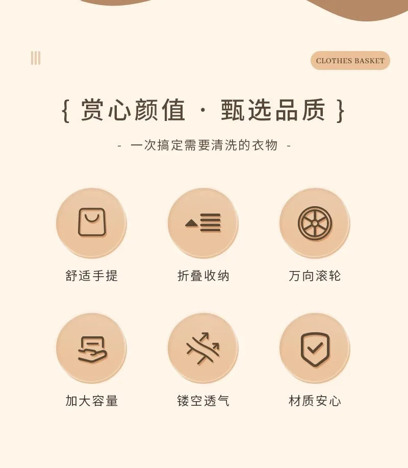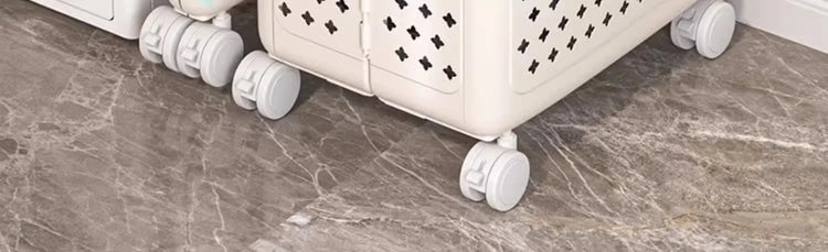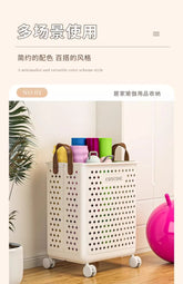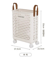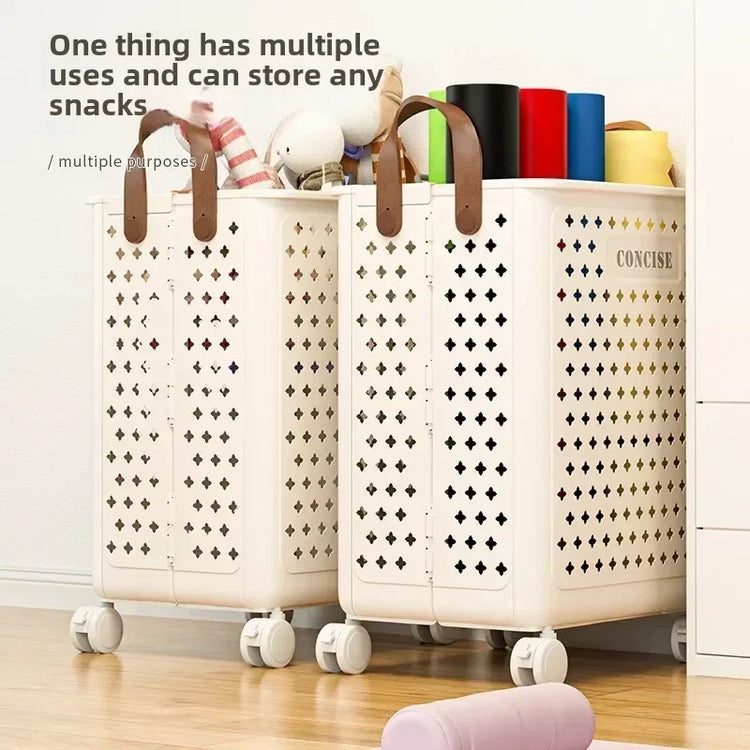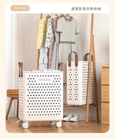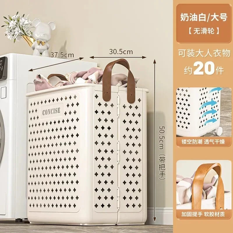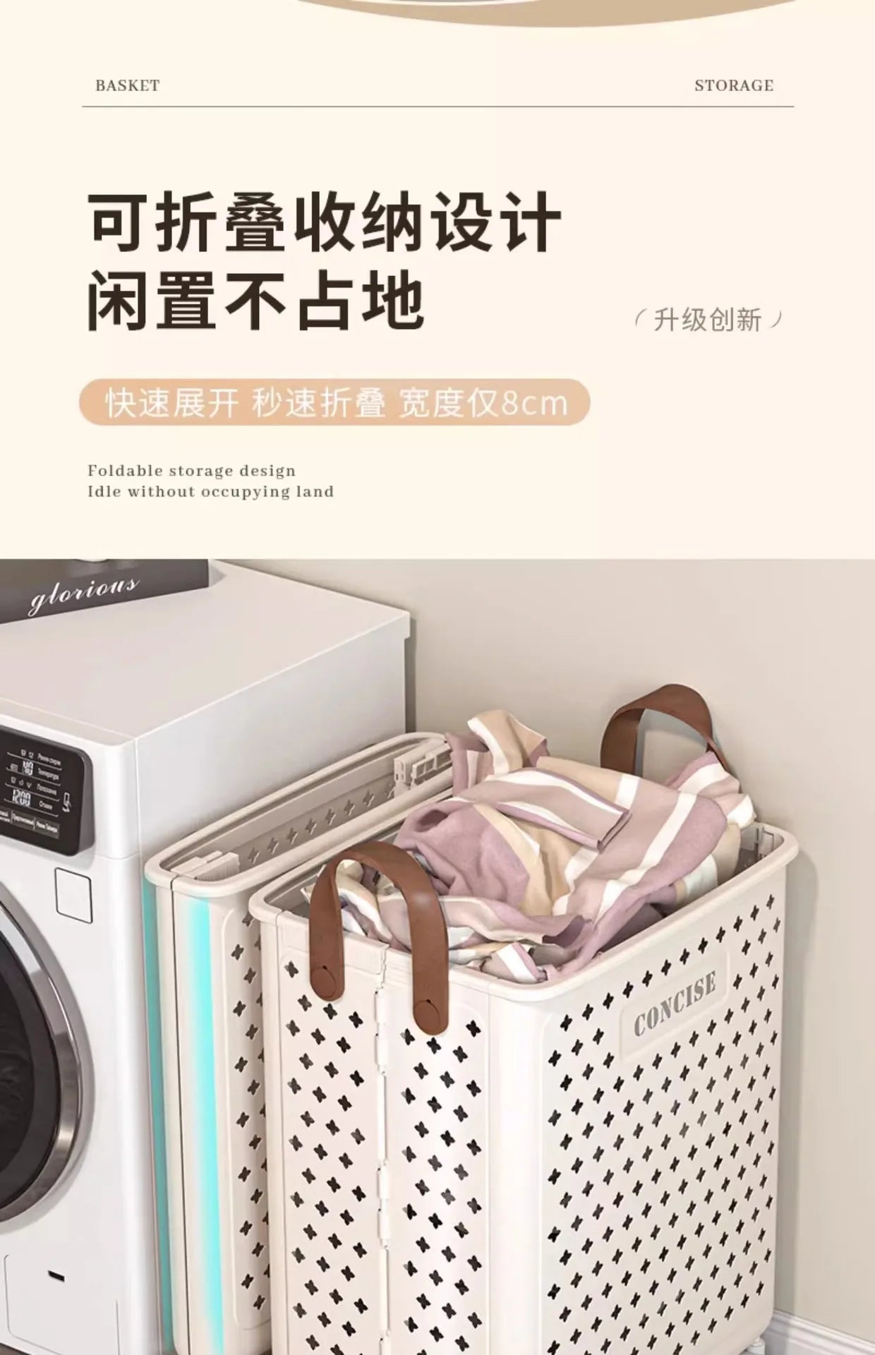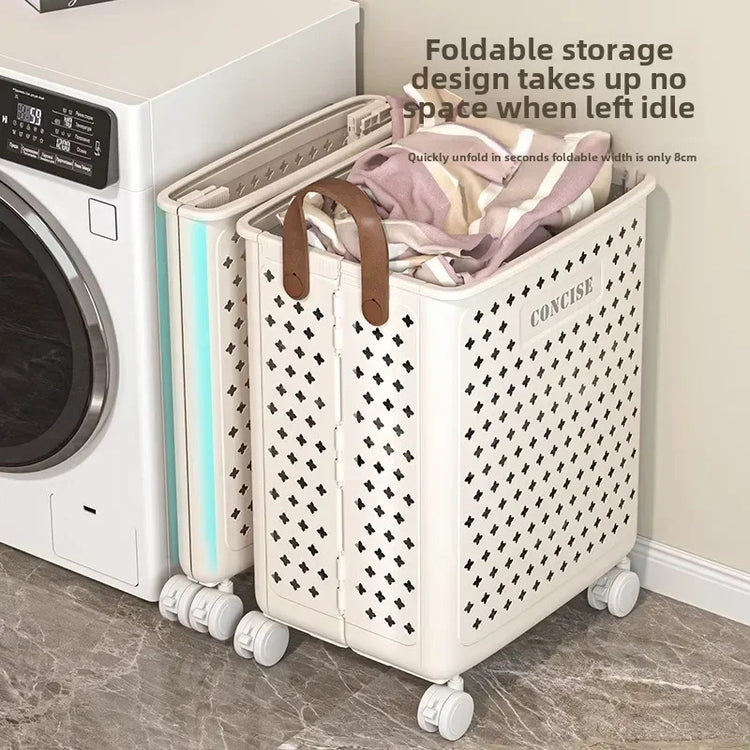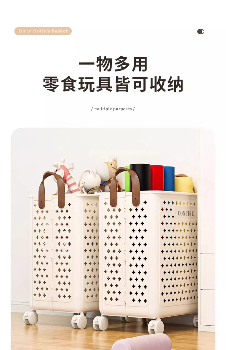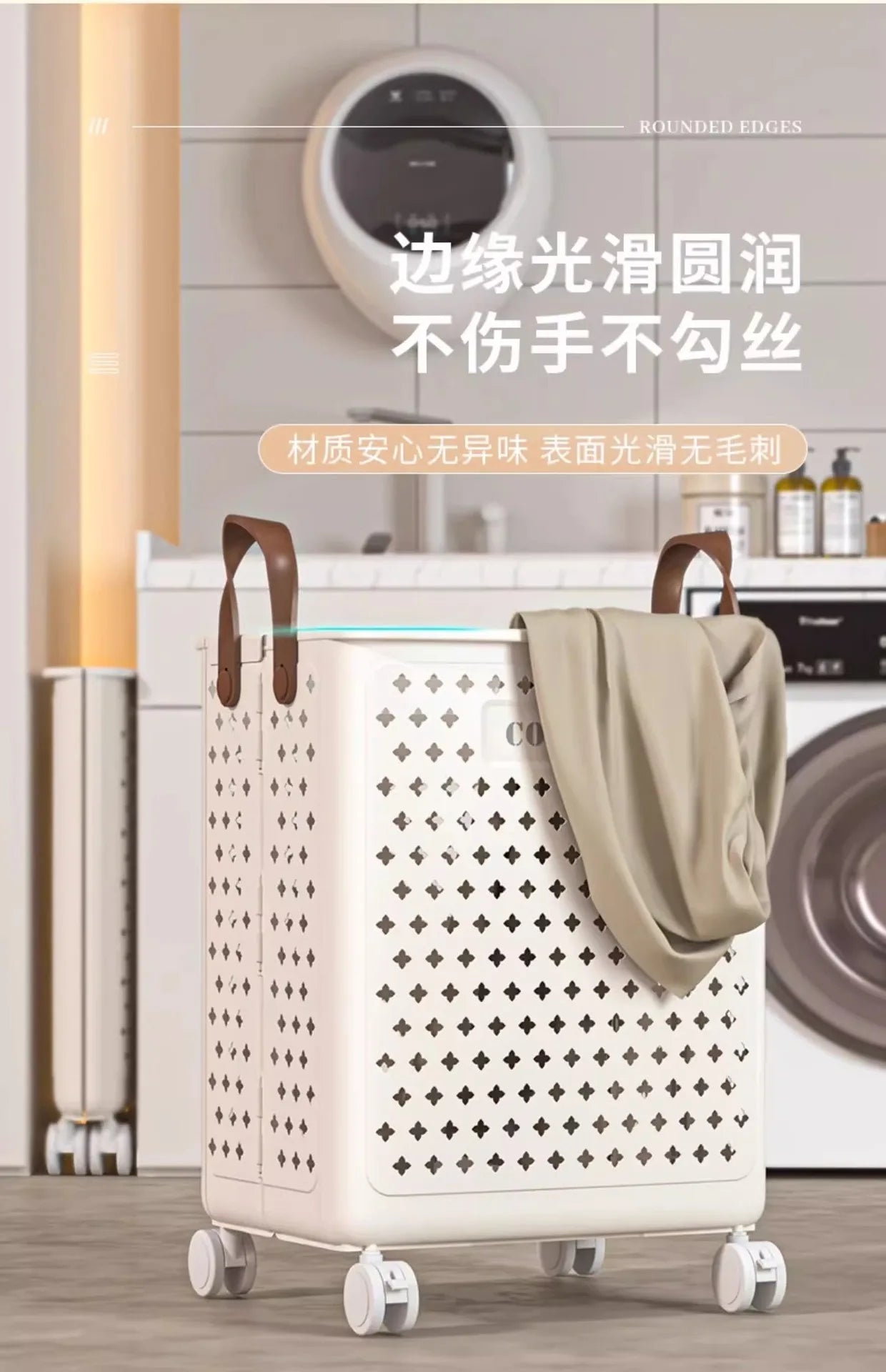 A folding laundry basket with wheels and a convenient handle for easy movement. Its hollowed-out, breathable design provides ample storage space while keeping clothes fresh and organized.