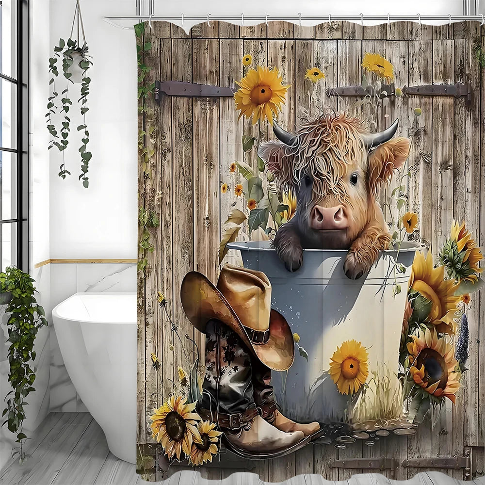 Bring rustic charm and countryside warmth to your bathroom with this Highland Cow Sunflower Shower Curtain. Featuring a delightful design of a highland cow surrounded by vibrant sunflowers, it adds a cheerful and cozy farmhouse touch to any space. Made from high-quality waterproof polyester, this curtain is durable, easy to clean, and comes with sturdy hooks for quick installation. Perfect for brightening your bathroom décor with a blend of nature-inspired beauty and rustic elegance.
