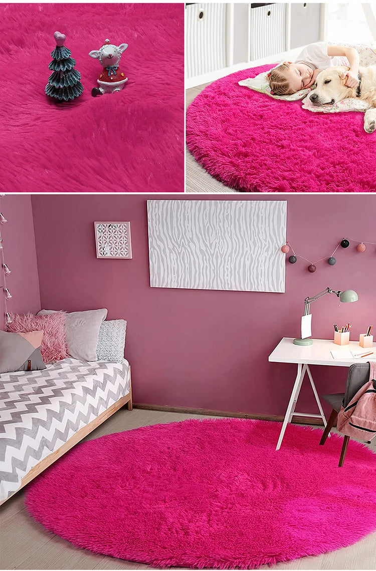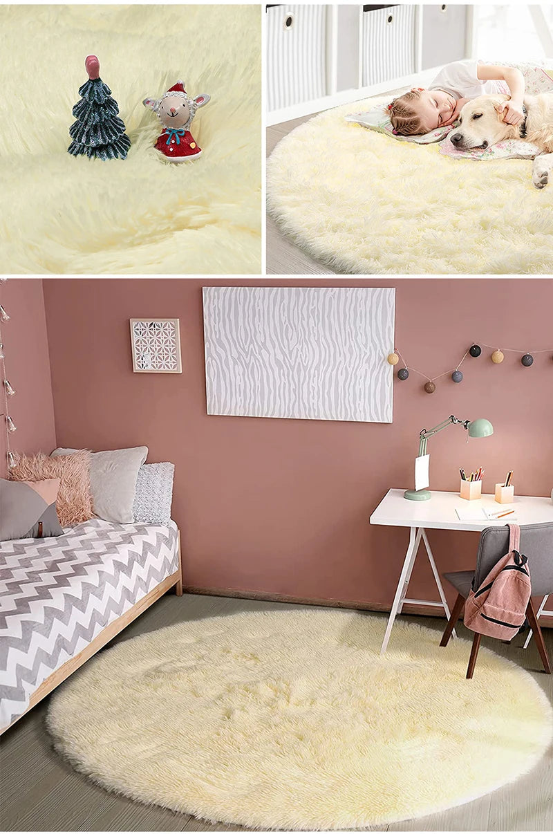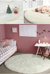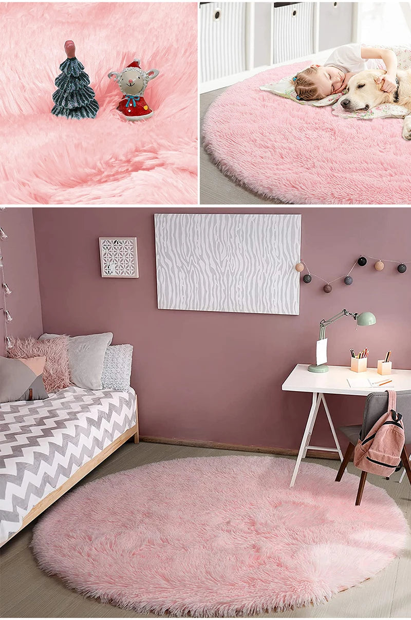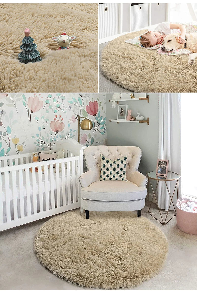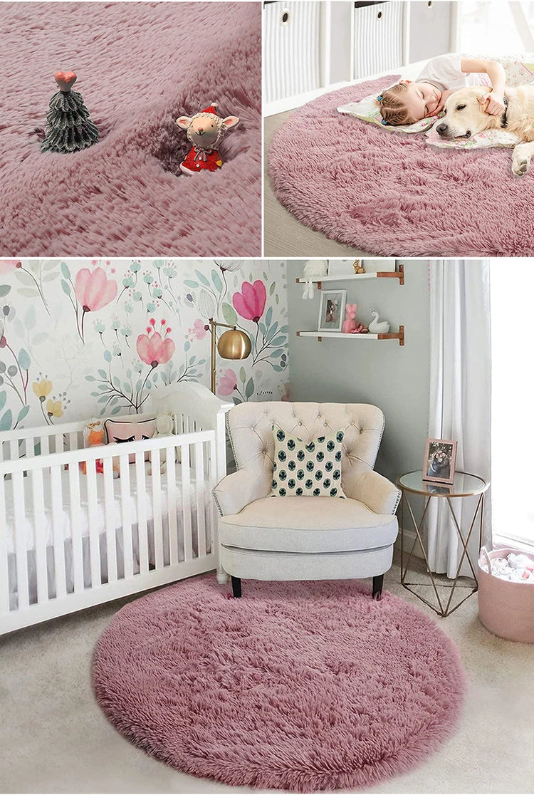 A soft, fluffy round carpet designed for bedrooms or living rooms, adding warmth and comfort to any space. Its cozy texture and stylish look make it perfect for girls’ rooms, home décor, or as a gentle play mat for babies.