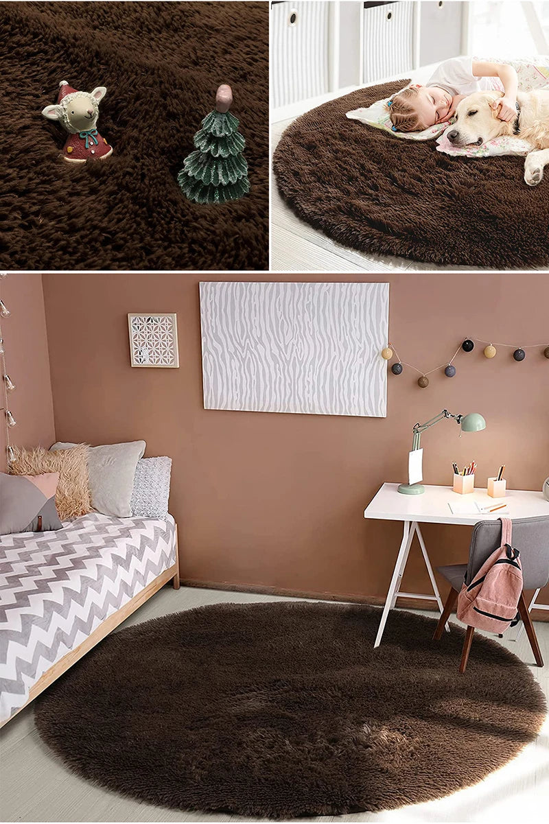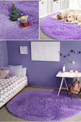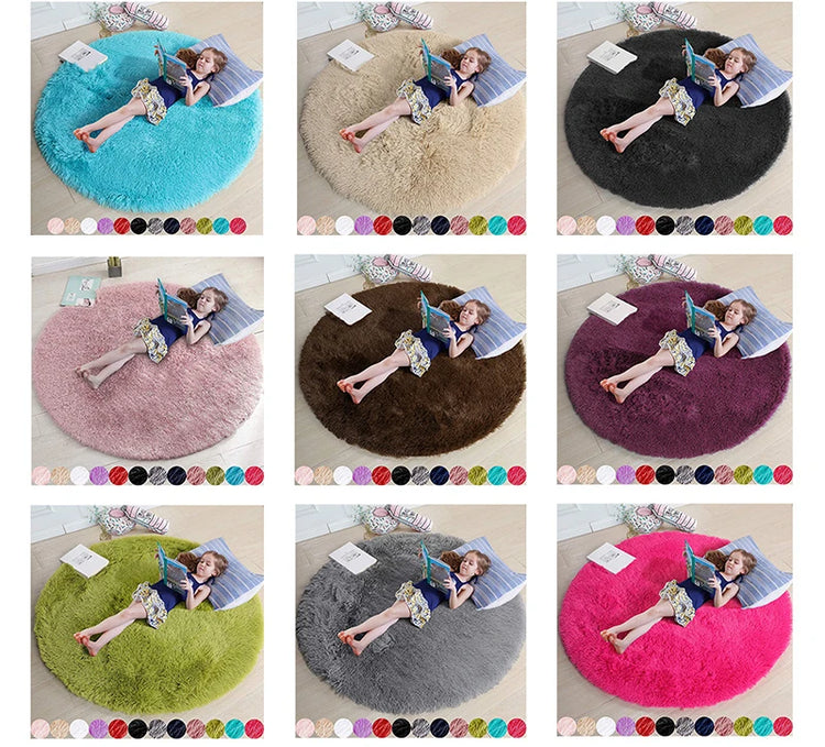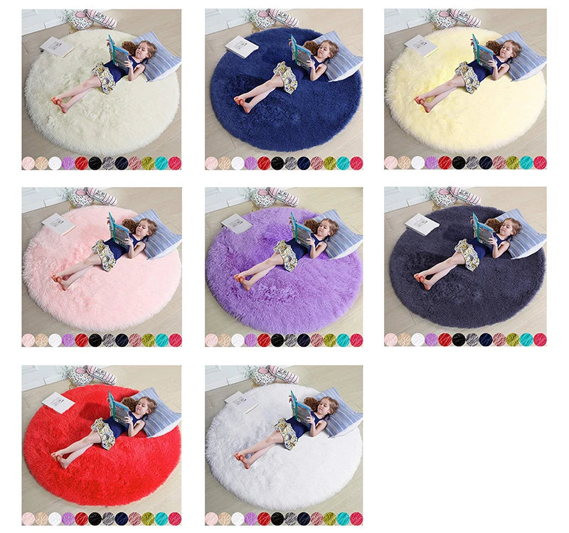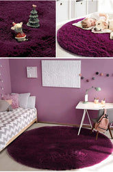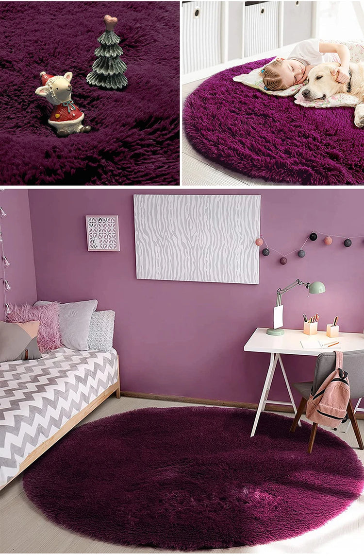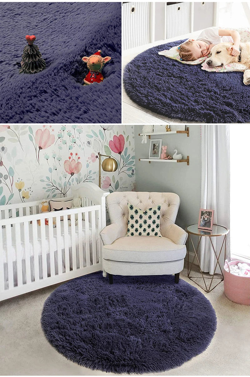 A soft, fluffy round carpet designed for bedrooms or living rooms, adding warmth and comfort to any space. Its cozy texture and stylish look make it perfect for girls’ rooms, home décor, or as a gentle play mat for babies.