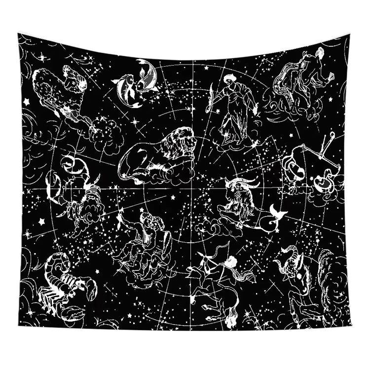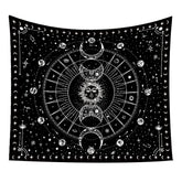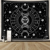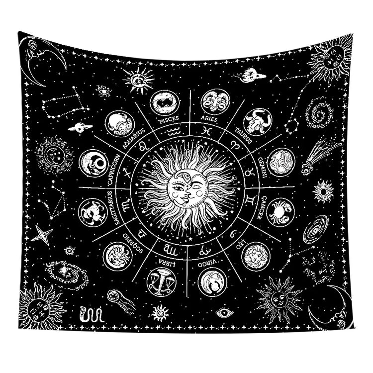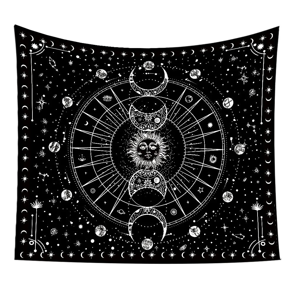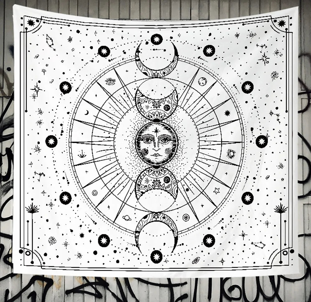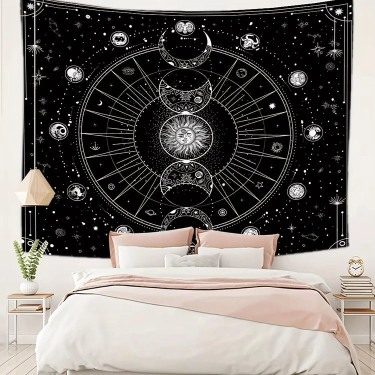 An embroidered tapestry featuring star and moon constellation designs. Perfect for boho-style living rooms, bedrooms, or meditation spaces, it adds a serene and celestial touch to your décor.