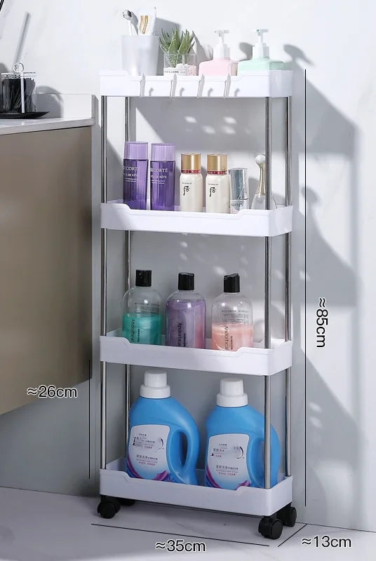 A multifunctional rack with 3 or 4 layers and smooth-rolling wheels for easy movement. Ideal for organizing food, hygiene products, or household items in the bathroom, kitchen, or living room.