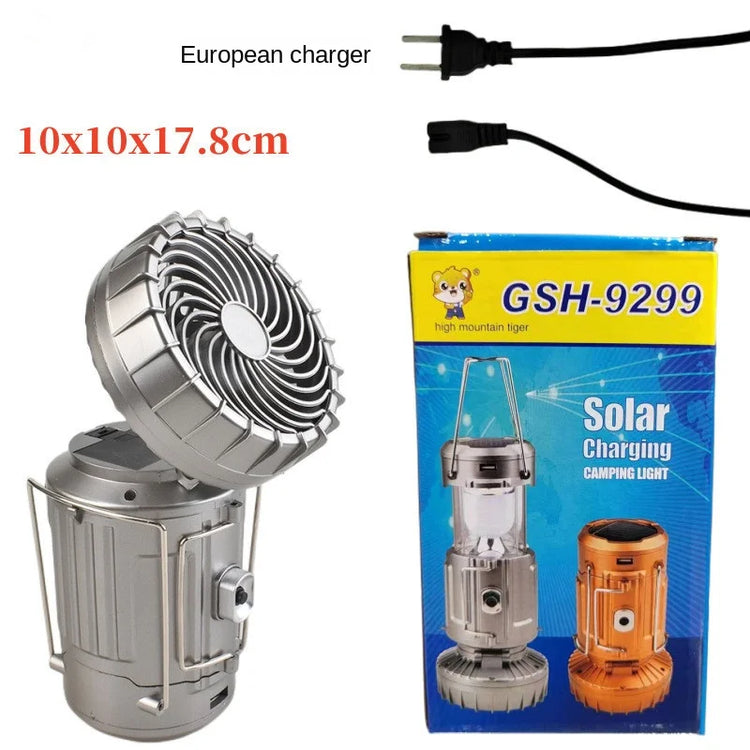 Stay cool and illuminated with this multi-functional camping light and electric fan. Featuring solar and USB charging, it’s perfect for outdoor adventures, night markets, or home use, offering convenient lighting and portable comfort.
