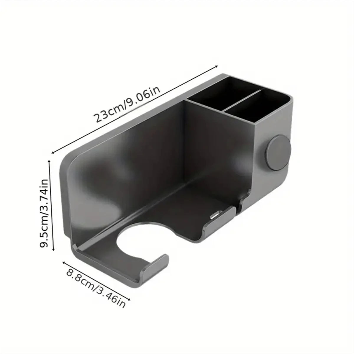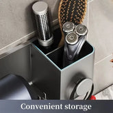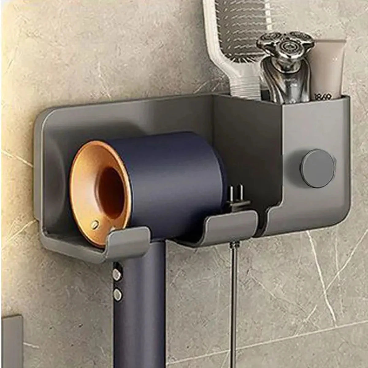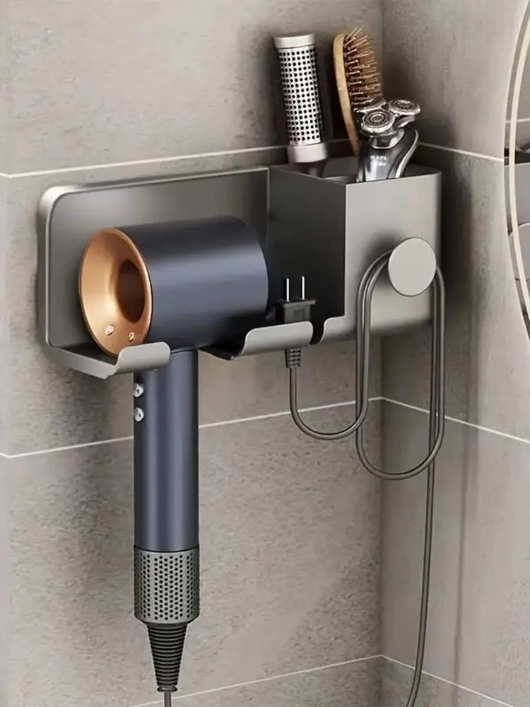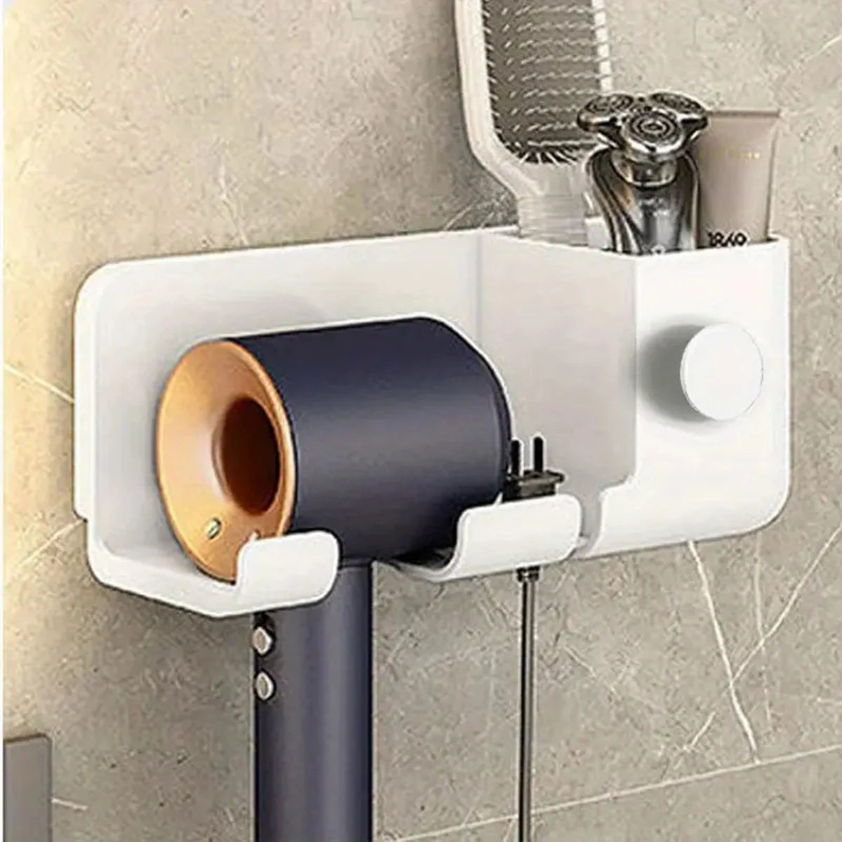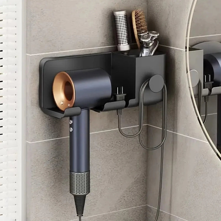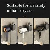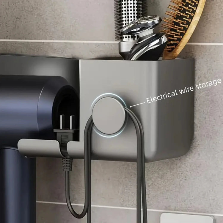 A wall-mounted storage holder designed for keeping electric hair dryers organized and accessible. Its perforation-free design makes installation easy and ideal for maintaining a tidy bathroom space.