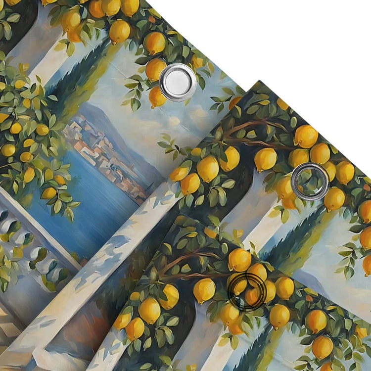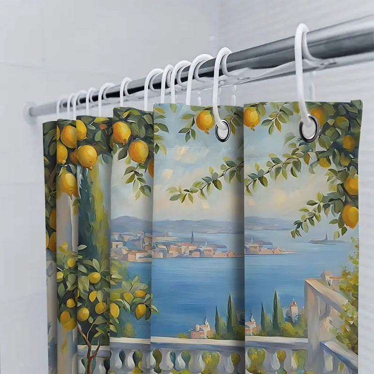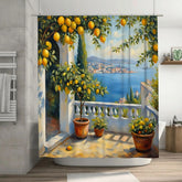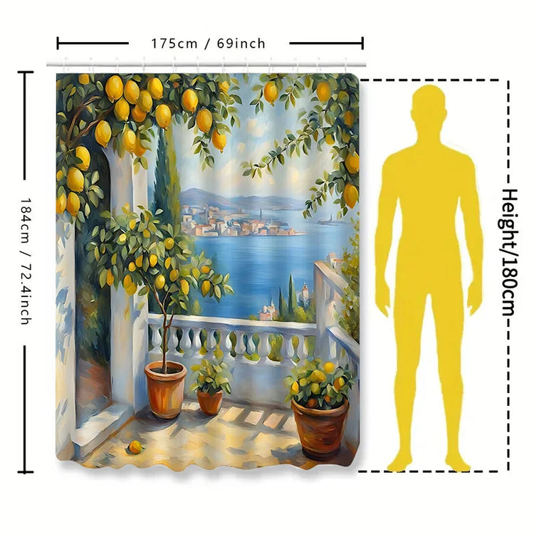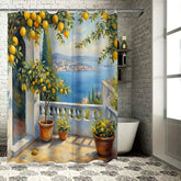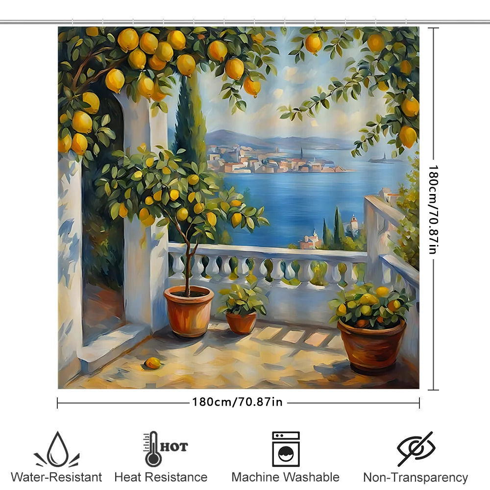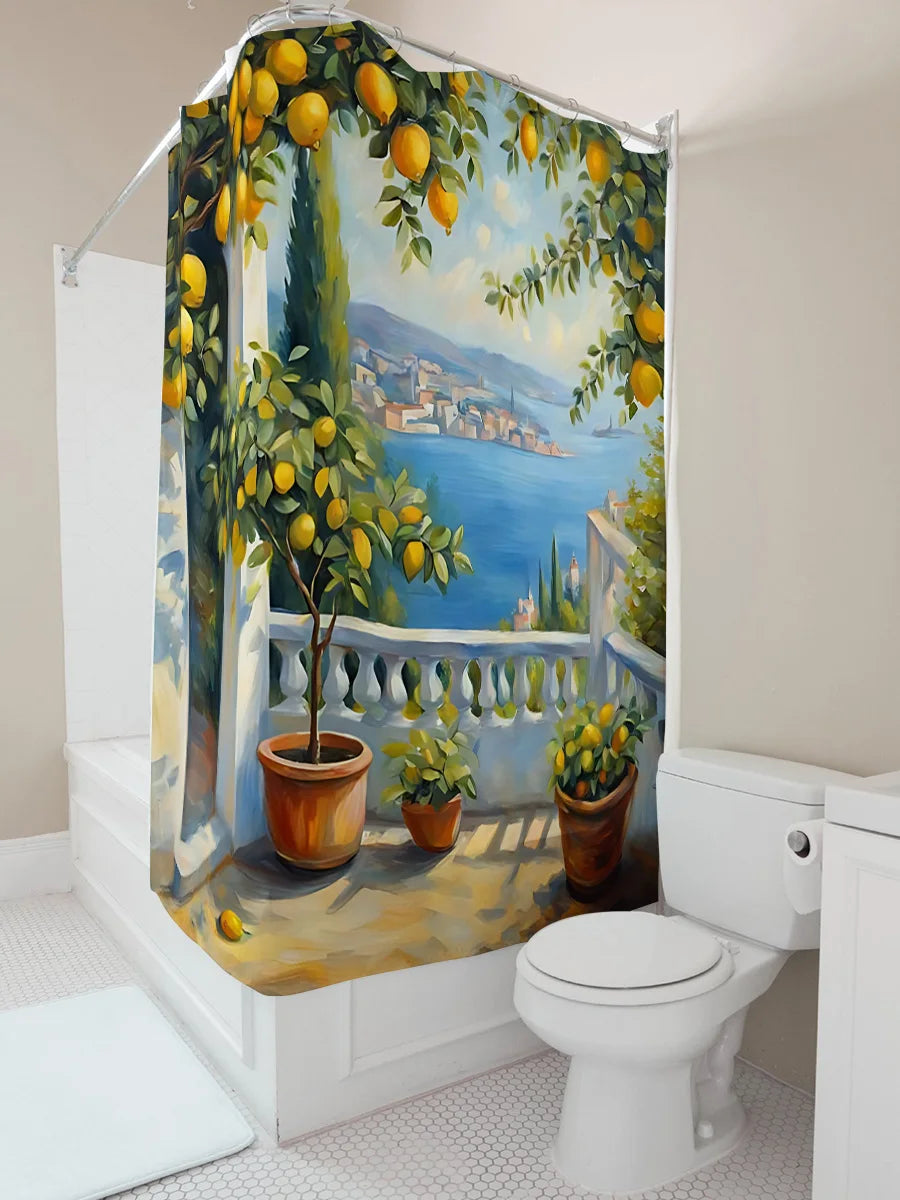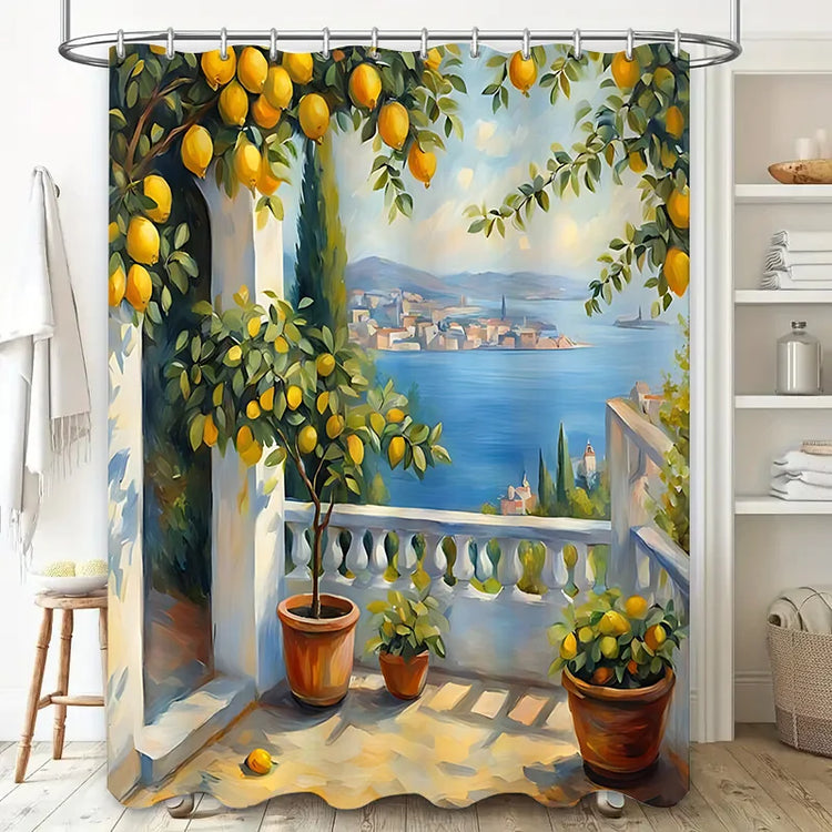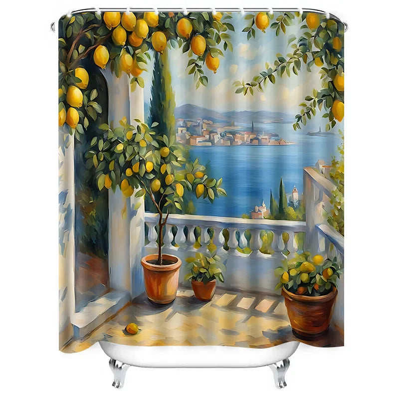 Bring a touch of the Mediterranean into your bathroom with this elegant lemon tree shower curtain. Featuring a beautiful artistic painting of potted plants and a serene sea view, it creates a refreshing and sophisticated atmosphere while keeping your space dry and stylish.