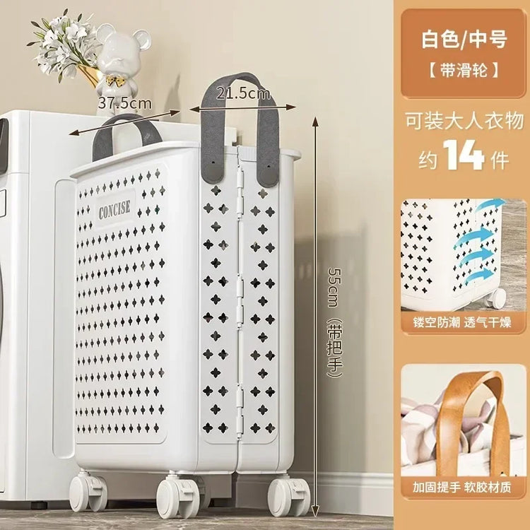 A folding laundry basket with wheels and a convenient handle for easy movement. Its hollowed-out, breathable design provides ample storage space while keeping clothes fresh and organized.
