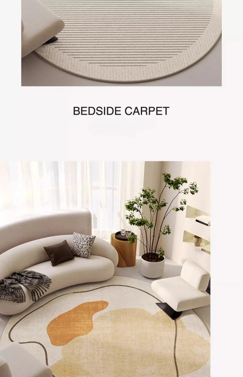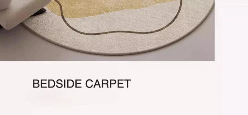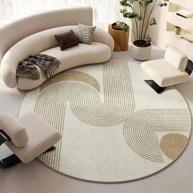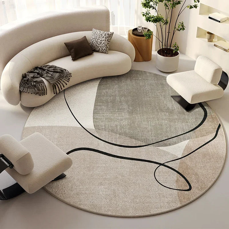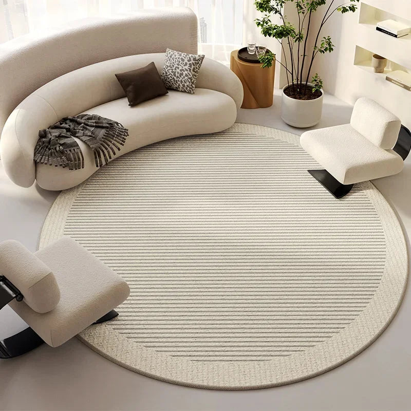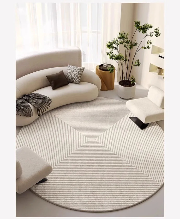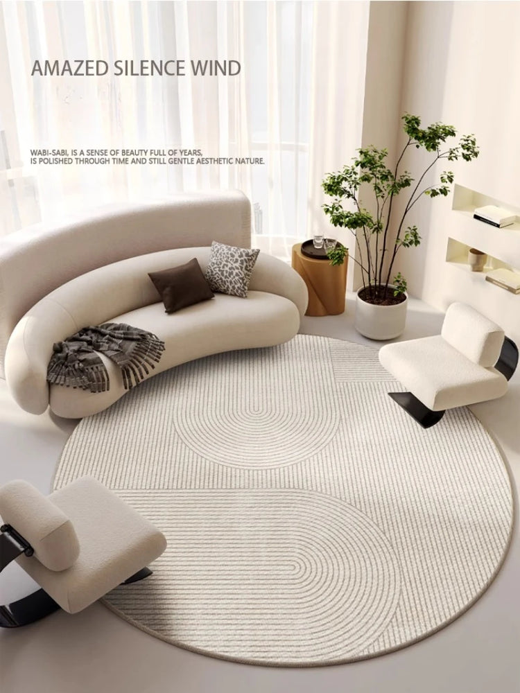 A stylish round rug in a light beige tone, designed to add a touch of luxury to any room. Its non-slip backing and simple design make it perfect for living rooms, bedrooms, or large open spaces.
