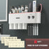 A wall-mounted magnetic toothbrush holder with an inverted design and dual automatic toothpaste dispensers. It keeps your bathroom organized and convenient while maintaining a clean, modern look.