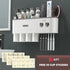 A wall-mounted magnetic toothbrush holder with an inverted design and dual automatic toothpaste dispensers. It keeps your bathroom organized and convenient while maintaining a clean, modern look.