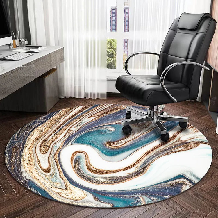 A modern round carpet with a geometric marble design accented in metallic gold and silver tones. Its non-slip surface and artistic style make it ideal for living rooms, offices, or elegant home décor.