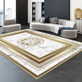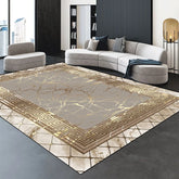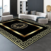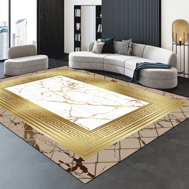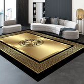 A modern golden rug designed to enhance living rooms or lounges with an elegant touch. Its non-slip design ensures stability, making it perfect for bedrooms, coffee table areas, or customizable home décor.