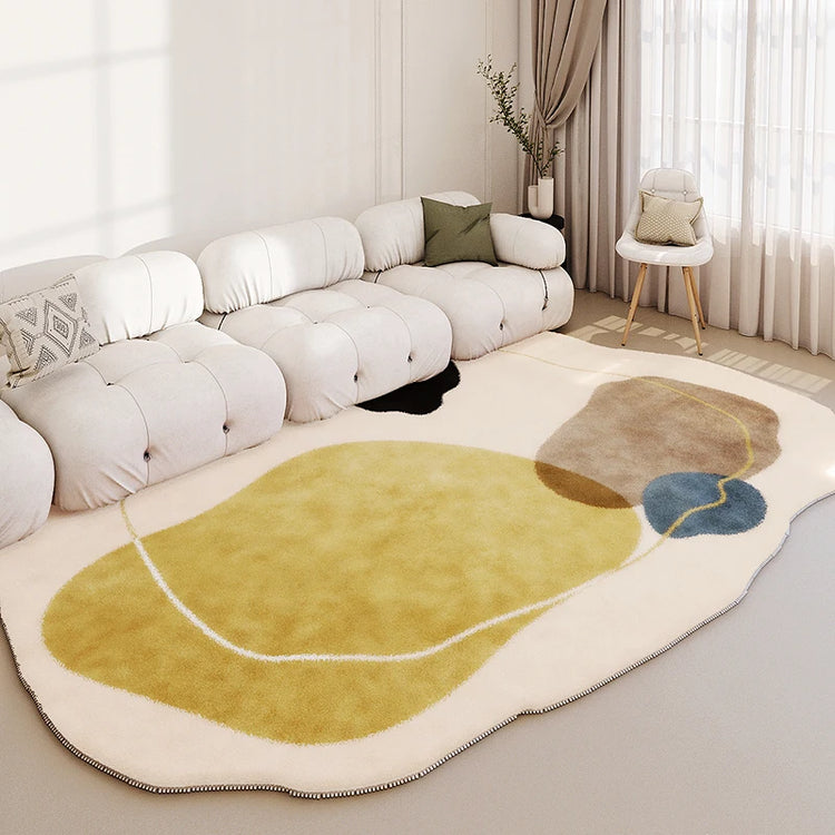 A modern golden rug designed to enhance living rooms or lounges with an elegant touch. Its non-slip design ensures stability, making it perfect for bedrooms, coffee table areas, or customizable home décor.