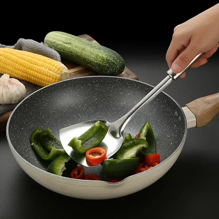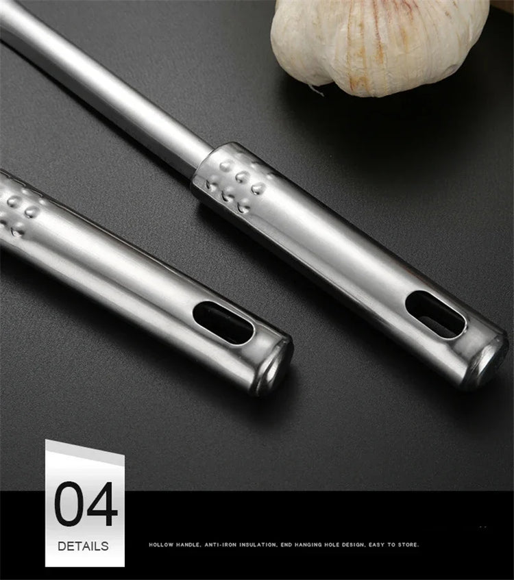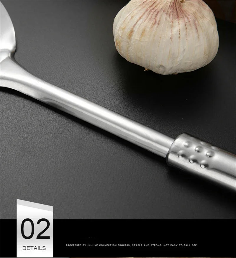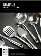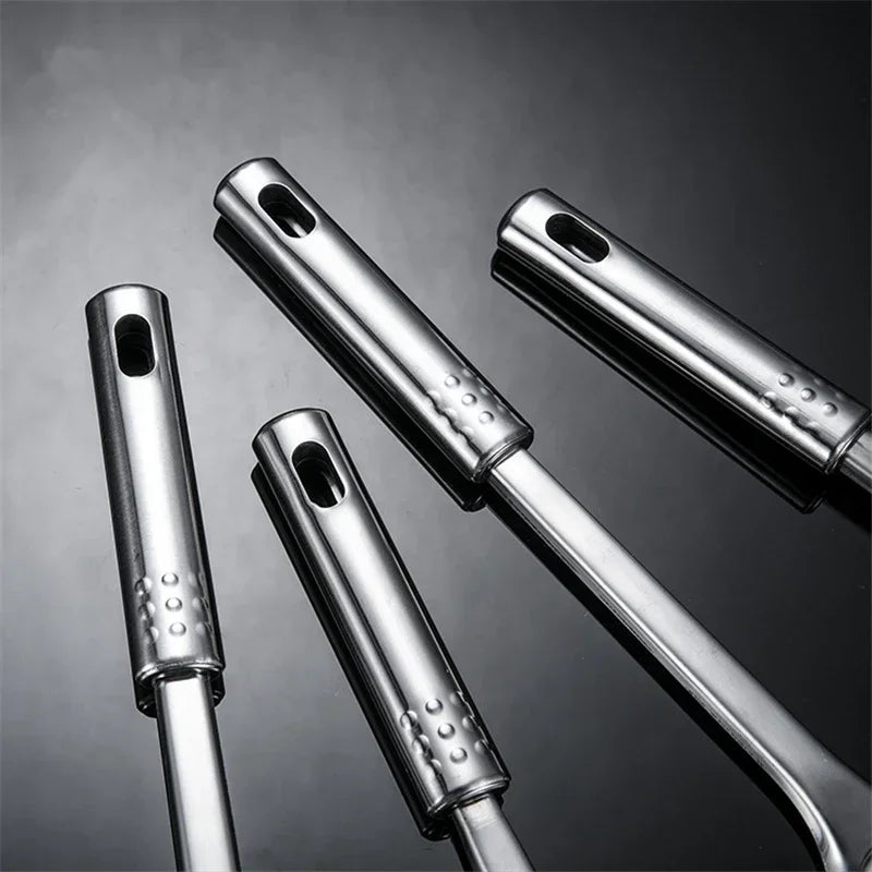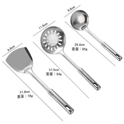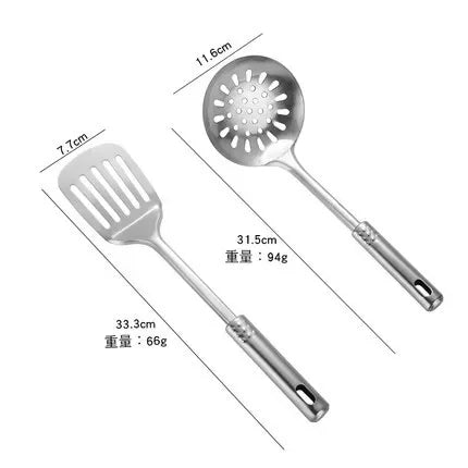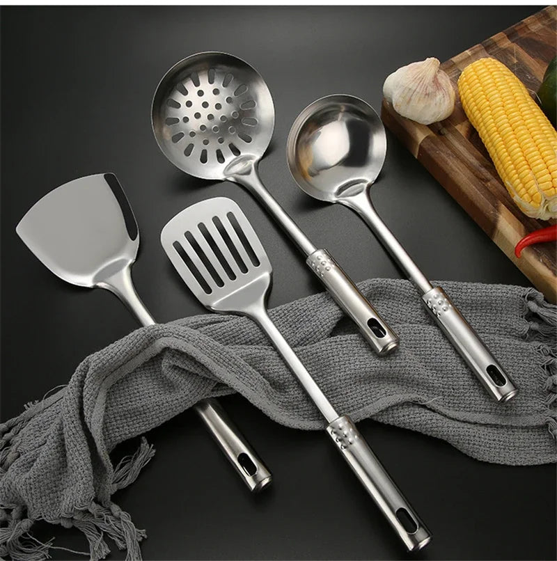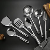 A stainless steel cooking set that includes spatulas, shovels, colanders, and soup spoons. Durable and stylish, it’s perfect for everyday cooking and complements any modern kitchen.