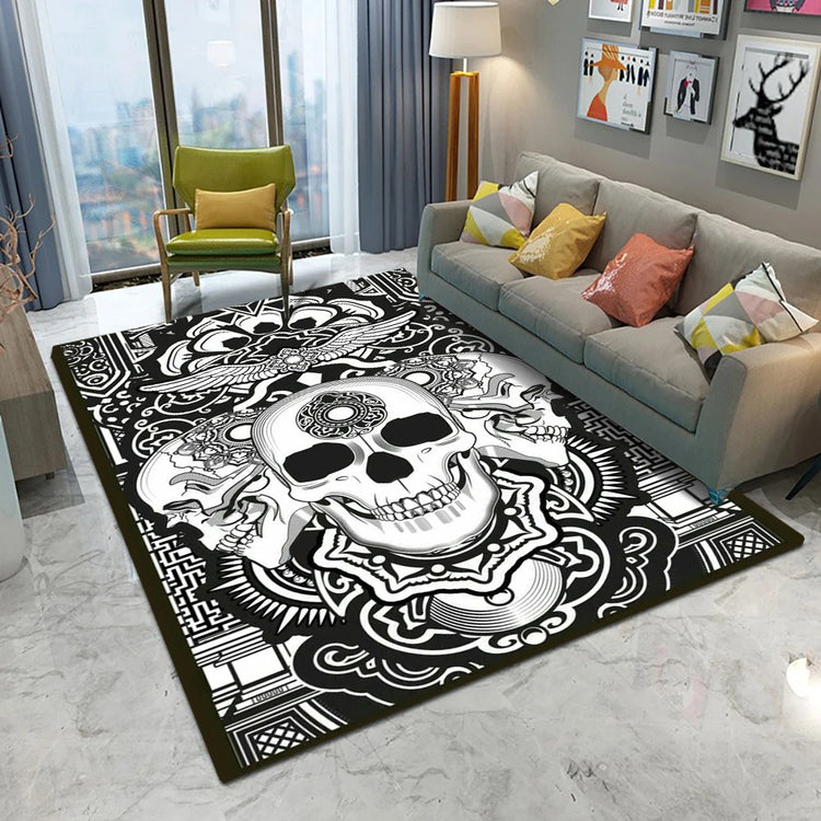 A retro-style decorative rug featuring a unique skull and playing card pattern. Its non-slip design makes it suitable for living rooms, bedrooms, studies, or as a bold entrance mat.