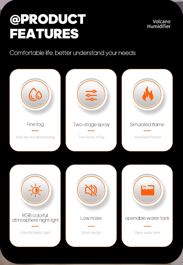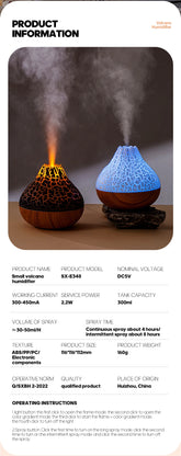 A 300ml USB-powered air humidifier designed with a volcano-style mist effect. It functions as a diffuser and air purifier, featuring colorful ambient night lights for a relaxing atmosphere on any desktop.